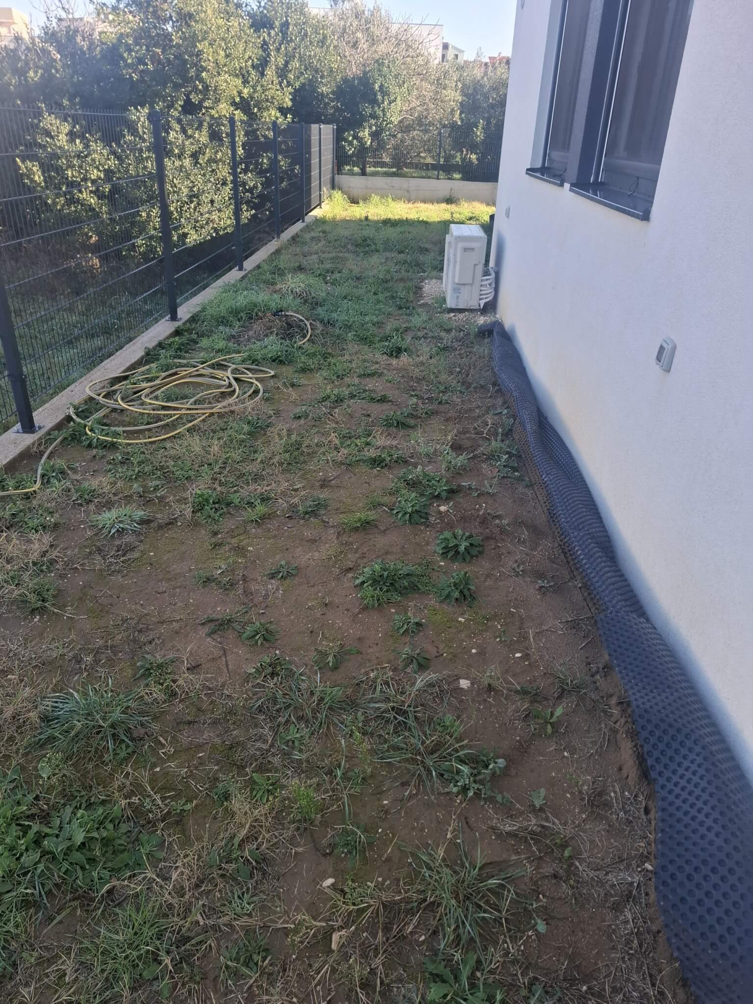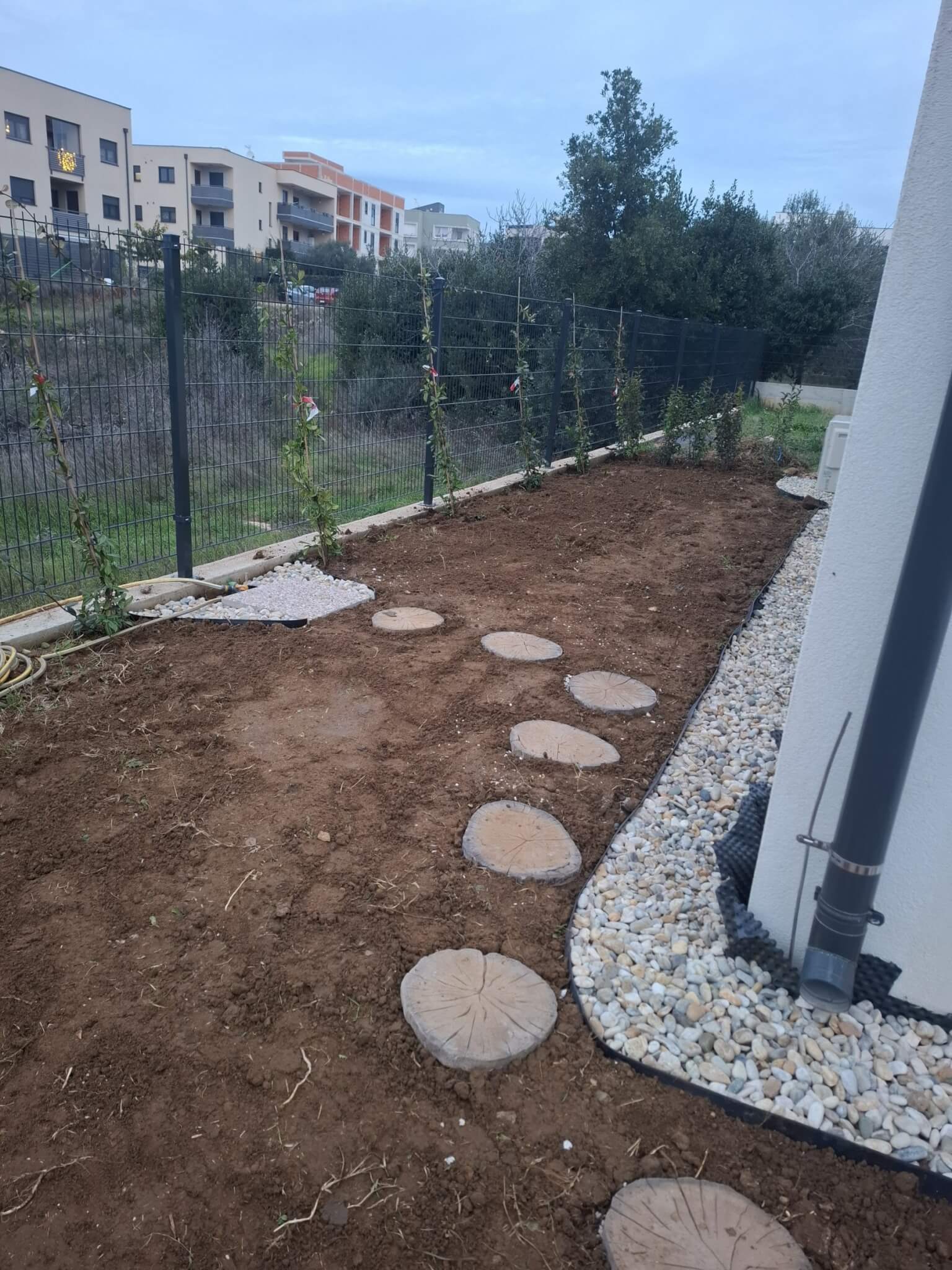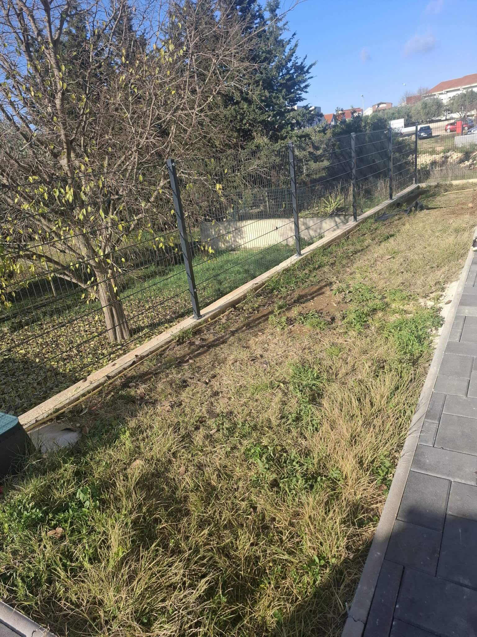 Želja klijenta je bila urediti travnjak sa ukrasnim biljem te zajednički dio na ulazu u zgradu. Uz ogradu smo posadili jasmin jednim dijelom te drugim dijelom male grmove puzajućeg ružmarina i timijana. Također uz rub je posađena živica od ligustruma te jedno stablo mimoze. Zajednički dio zgrade je uređeno sa sitnim grmovima poput lavande, smilja, kadulje u kombinaciji sa sitnim tucanikom. Također napravljena je i mala stazica u vrtu